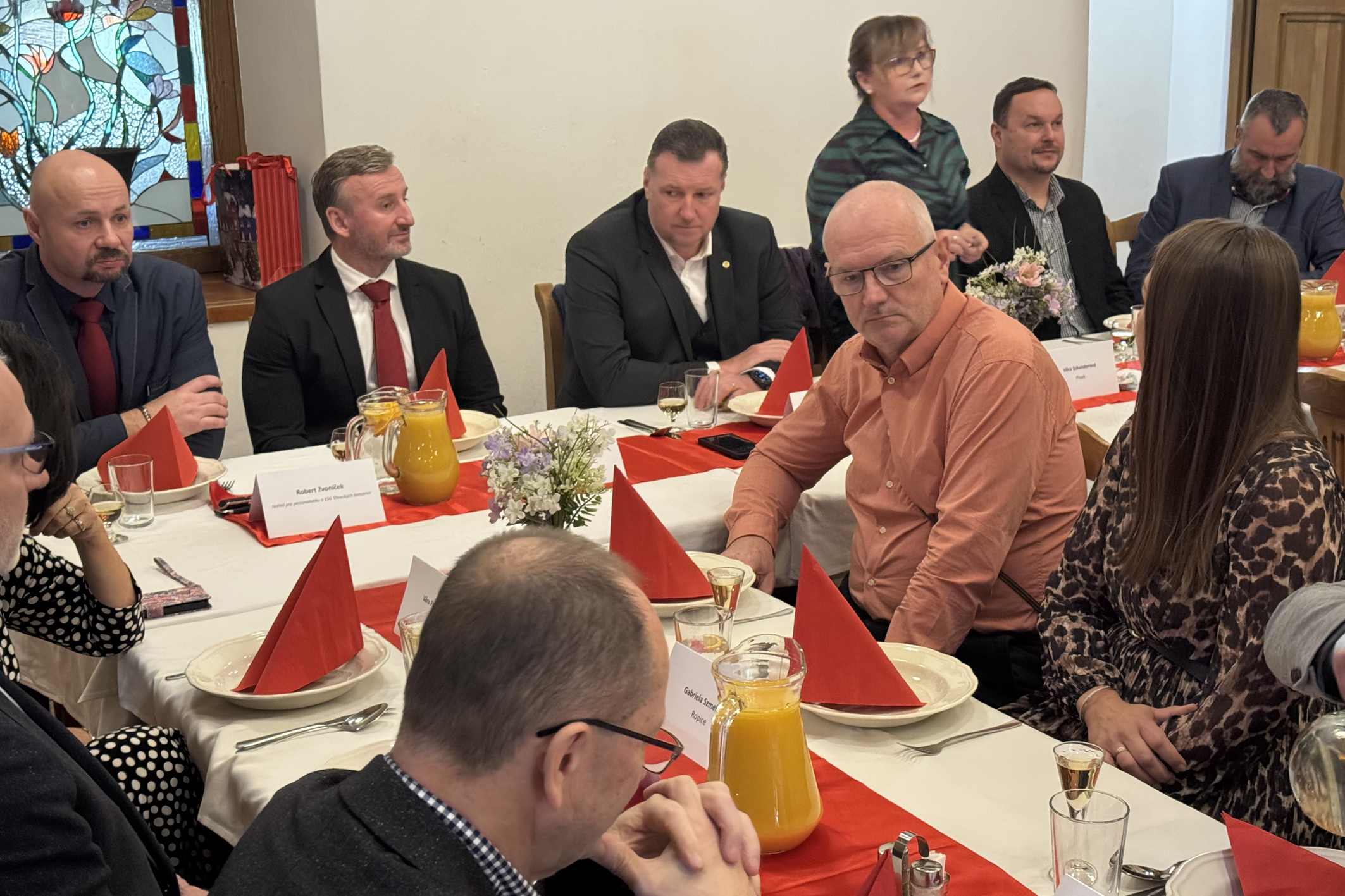 Generální ředitel firmy Roman Heide jim nastínil dekarbonizační plány firmy, které jsou nezbytné pro splnění podmínek evropské legislativy. Vysvětlil důvody odložení investice do elektrické obloukové pece a popsal současnou situaci na trhu s ocelí. Investiční plány pro příští rok přiblížil investiční ředitel Daniel Heczko. Mezi jinými zmínil také projekt horkovodu, který se dotkne Českého Těšína, Ropice i Třince, a jehož záměrem je využít odpadní teplo pro vytápění domácností, škol, nemocnice a dalších institucí v Českém Těšíně. Výstavba horkovodu je plánována na léta 2030 až 2032. Nyní probíhá projektová příprava akce. O zaměstnanosti a změnách na Střední průmyslové škole Třineckých železáren na závěr hovořil ředitel pro personalistiku a ESG Robert Zvoníček.