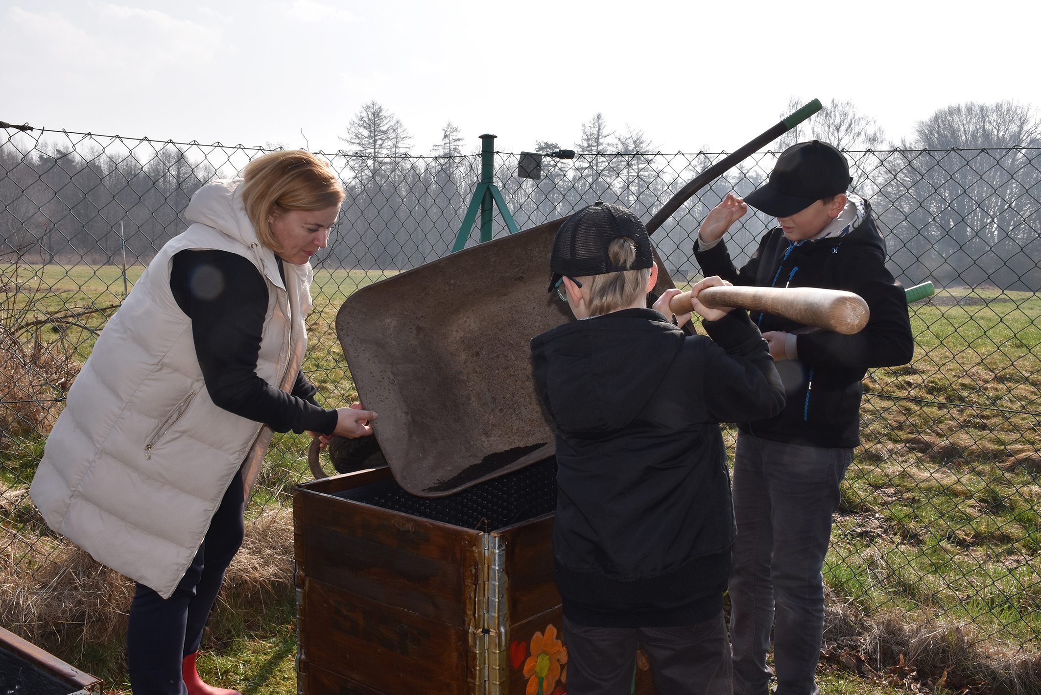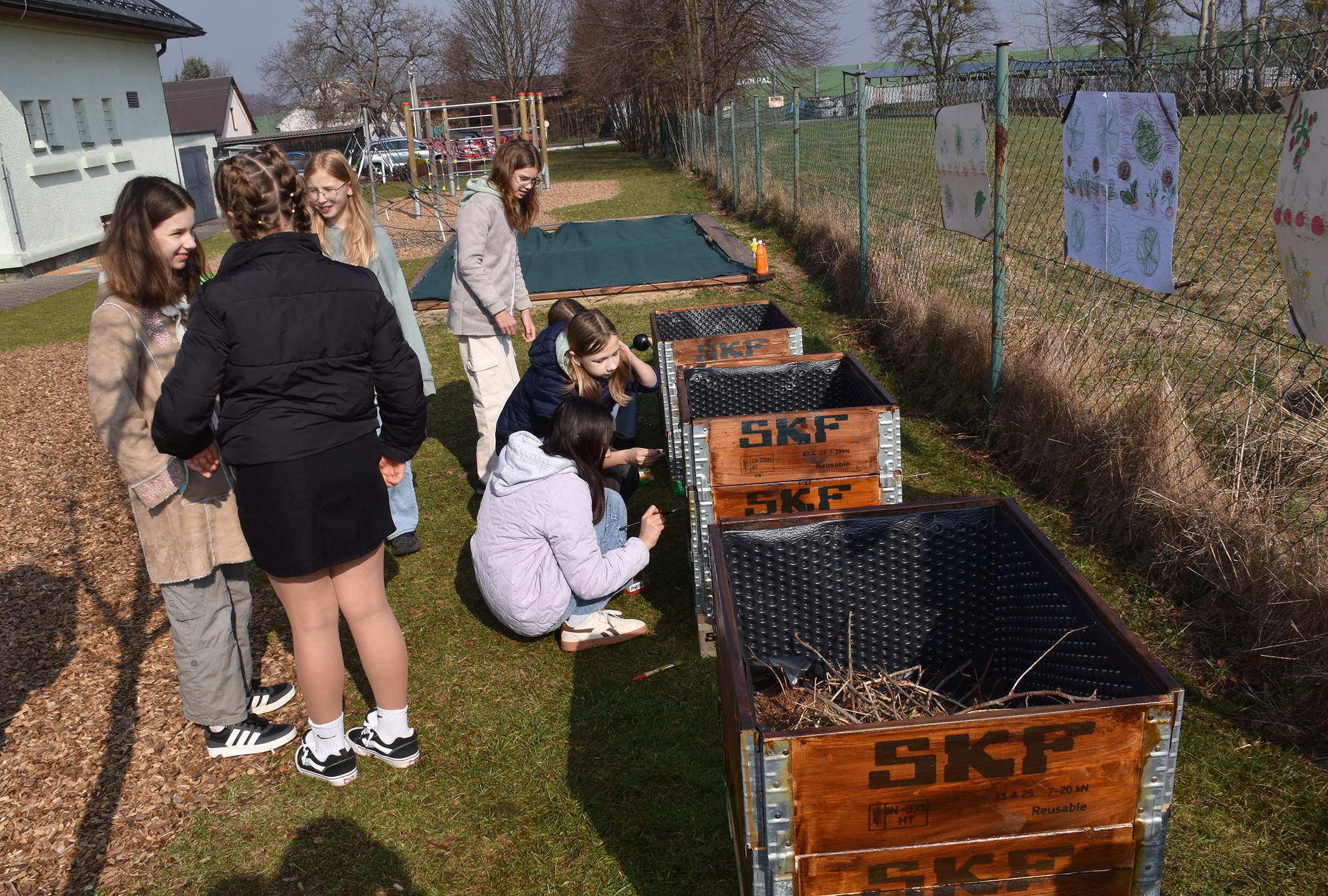Jakmile mohli, chopili se dva kluci koleček, začali je plnit kompostem a vozit a přesypávat do záhonů. Dívky mezitím dokončovaly výzdobu dřevěných bedýnek, které pomalovaly kytičkami.