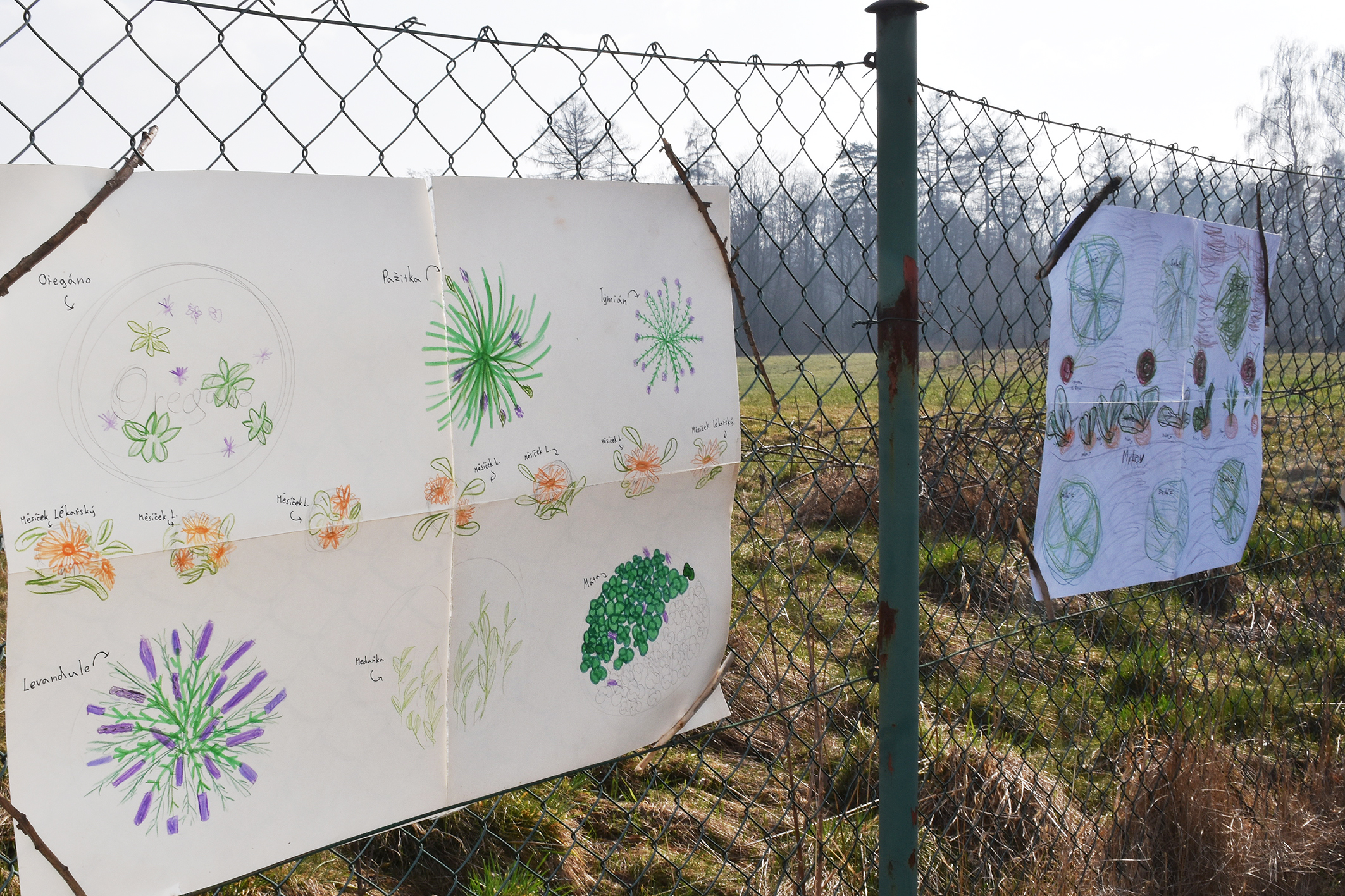 Na plotě jsou k vidění plakáty, na něž děti nakreslily zeleninu, kterou chtějí pěstovat.