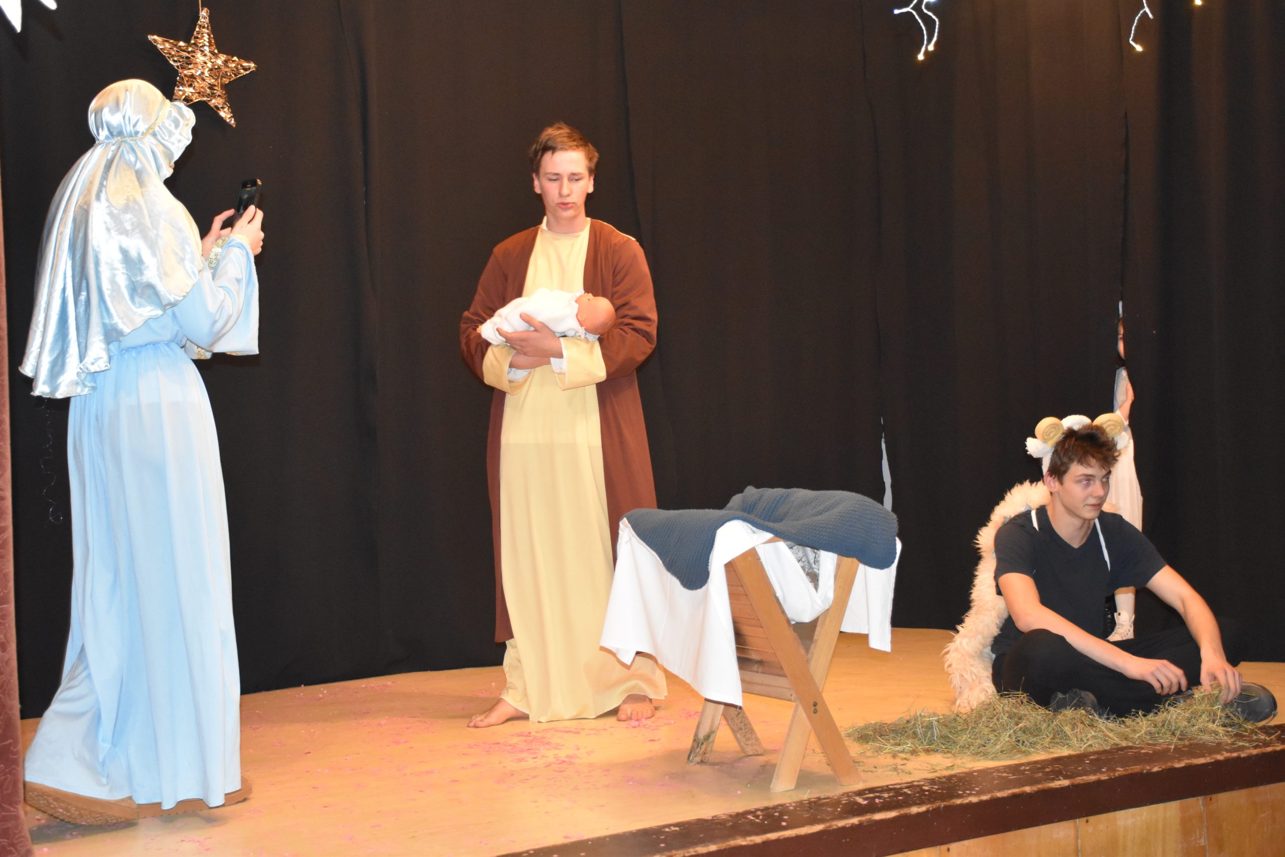 Bohaterami świątecznego popołudnia byli aktorzy Gapcia i Gapy – teatrzyków działających przy Miejscowym Kole PZKO. Publiczności zaprezentowali widowisko o Bożym Narodzeniu z nietradycyjnym podejściem. Nie zabrakło co prawda Bożej Dzieciny, pastuszków, aniołów czy Trzech Króli, ale byli też Tomio Okamura, Andrej Babiš, Elon Musk, Donald Trump oraz Matka Boska z nowoczesnym smartfonem oraz święty Józef dziękujący za wsparcie sponsorom.