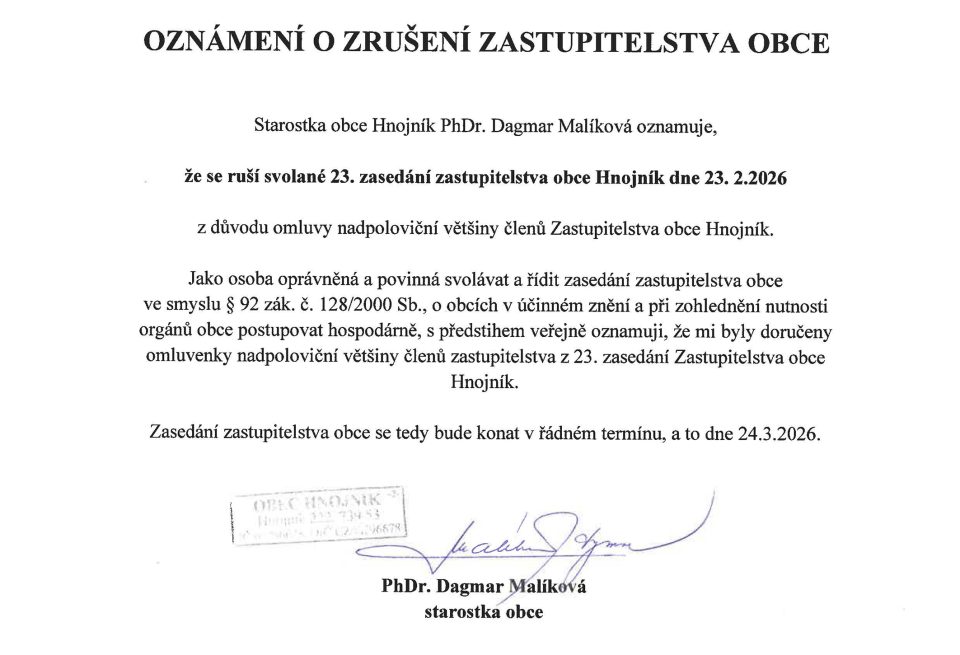 „Starostka obce Hnojník Dagmar Malíková oznamuje, že se ruší svolané 23. zasedání zastupitelstva obce Hnojník dne 23. 2. 2026 z důvodu omluvy nadpoloviční většiny členů Zastupitelstva obce Hnojník,“ napsala starostka.
